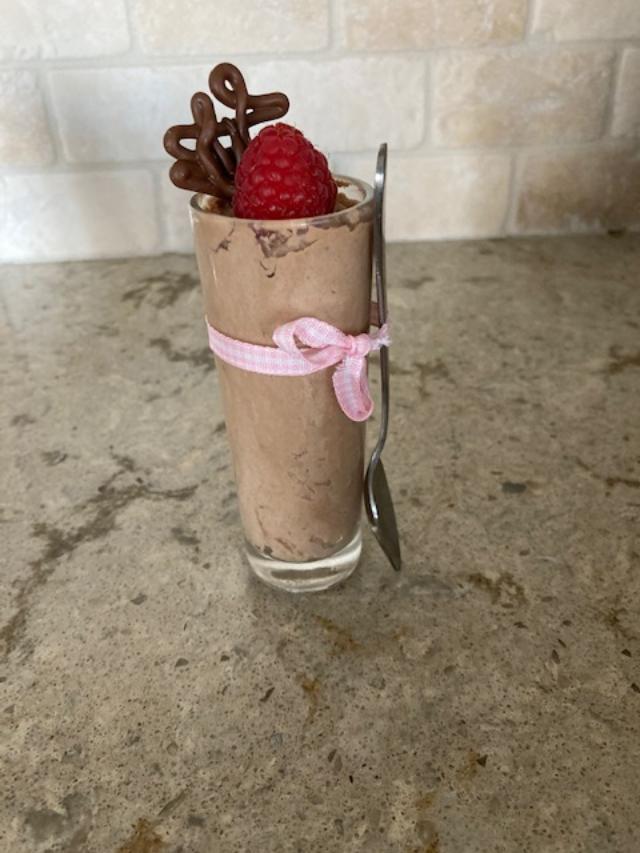 I love an easy recipe and this one only has 2 ingredients! There is no egg or gelatin like most mousse recipes, just heavy cream and chocolate. This mousse is definitely lighter in texture, but has the same great creamy taste as your classic French mousse. This can also be made 2 days in advance and kept in the refrigerator or frozen for up to a month. I made this for a luncheon in March and will put this dessert on repeat for my annual Spring Luncheon in April. I used mini shot glasses, tied a ribbon around a mini spoon, added a raspberry and chocolate garnish for presentation.